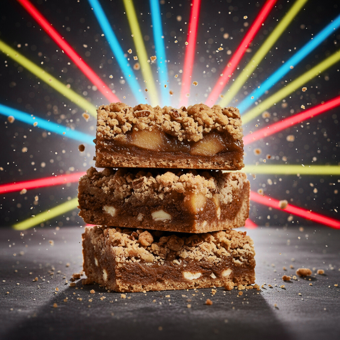 A brazen blast of cinnamon-spiced apple compote under a rubble of brown-sugar streusel “shrapnel,” all on a buttery oat flour blondie base.