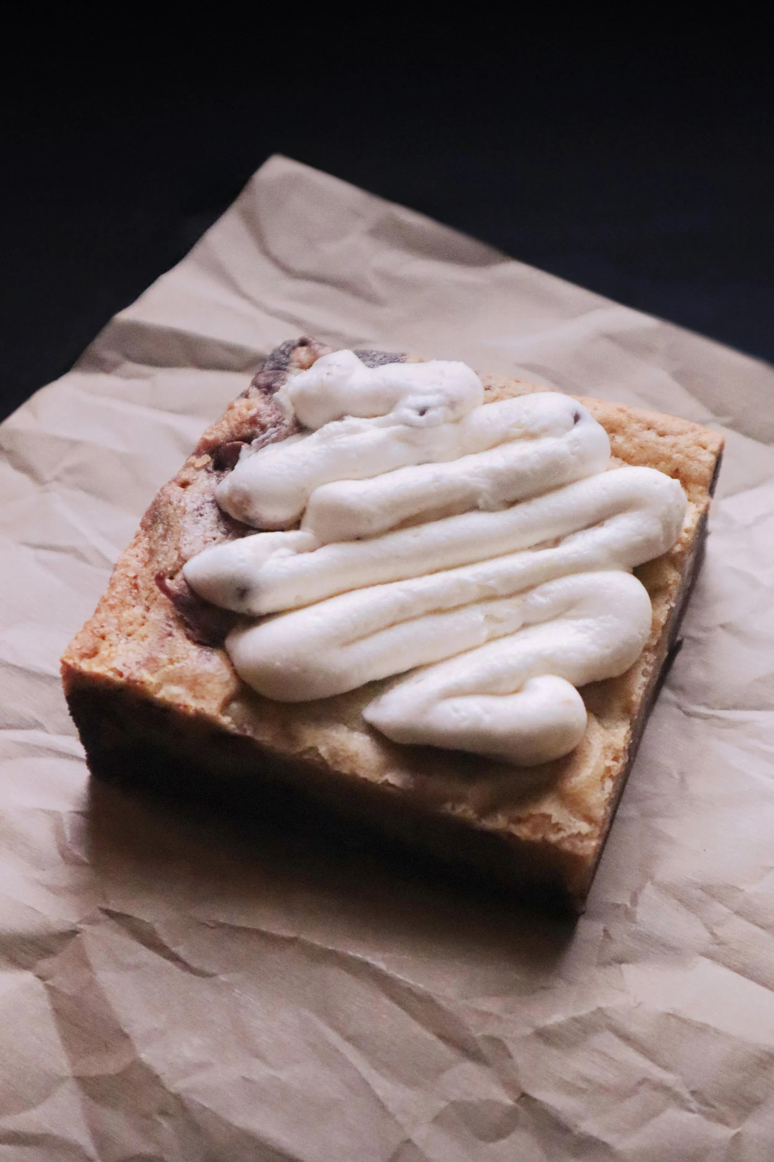 A brazen blast of cinnamon-spiced apple compote under a rubble of brown-sugar streusel “shrapnel,” all on a buttery oat flour blondie base.